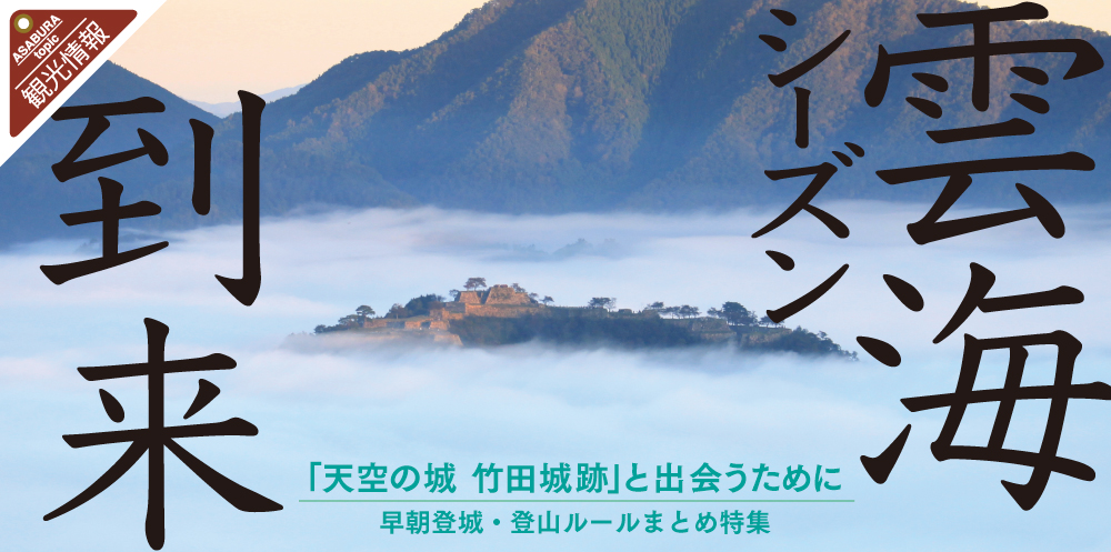 特集情報 竹田城跡 サマーシーズン 6月1日(土)から竹田城跡がサマーシーズンとなります。 観覧時間は朝6時から夕方18時(最終登城17時半)まで。 夏の竹田城跡にぜひお越しください! 竹田城跡観覧料 [大人] 500円(高校生以上) [中学生以下]無料 [年間 ... 2024.05.27 09:00