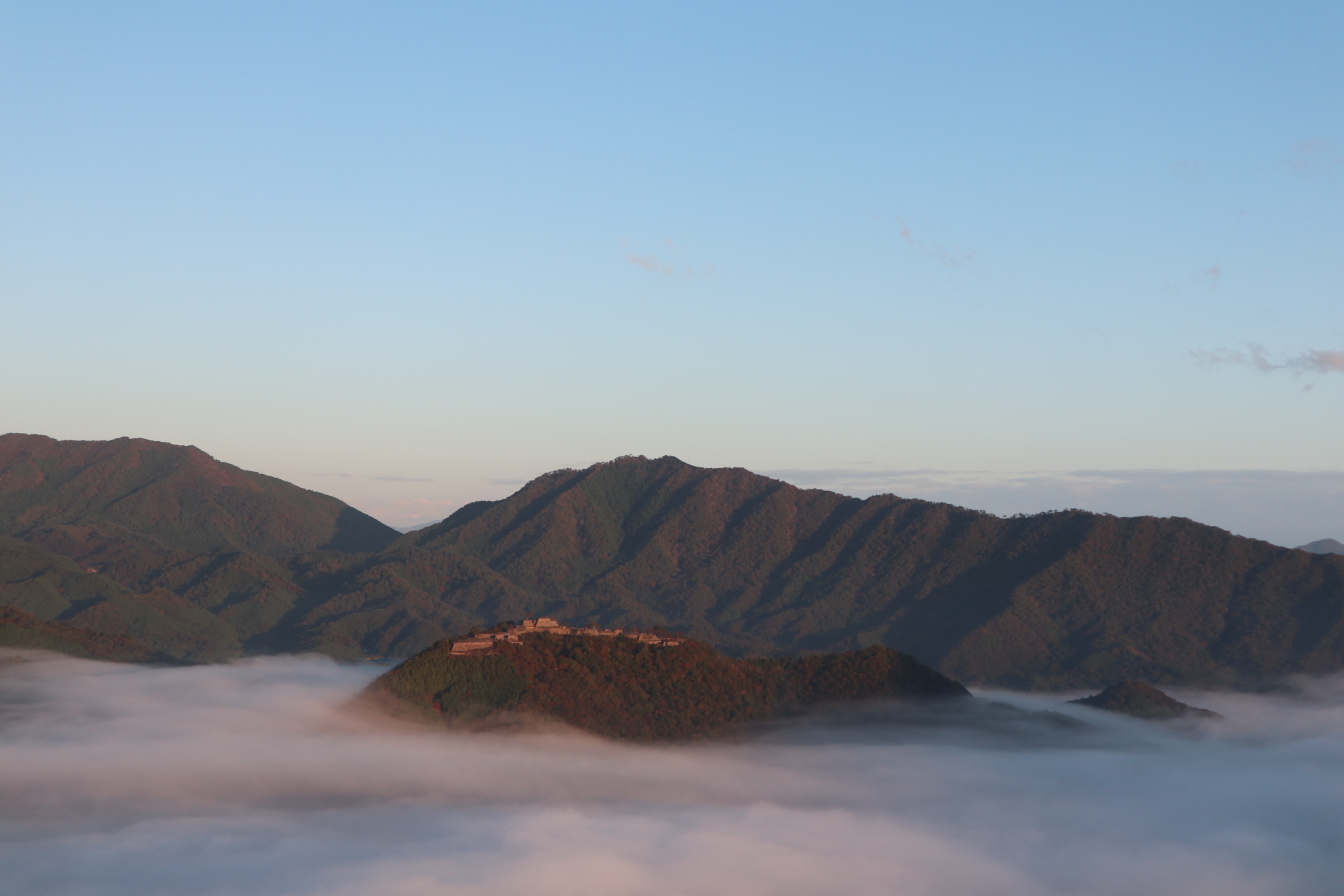 天空の城 青空と朝日の中の竹田城跡